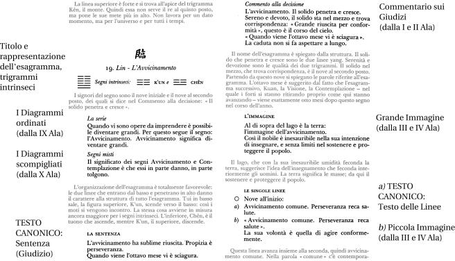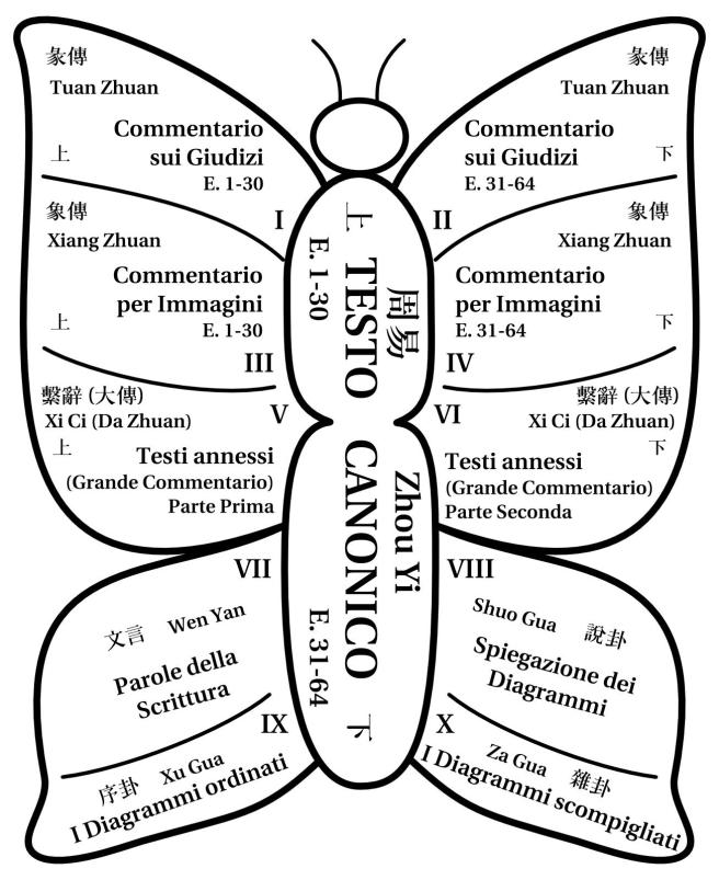 Alcuni di questi commentari hanno un ruolo fondamentale nella trasformazione dei Mutamenti da manuale divinatorio a testo sapienziale: in particolare lo Xi Ci (“Testi annessi”, noto anche come Da Zhuan, “Grande Commentario”, V e VI Ala) rappresenta un testo fondante del pensiero cinese in ambito filosofico, cosmologico e scientifico. Ad esso si affianca per importanza lo Shuo Gua (VIII Ala), più specificamente dedicato alla “Spiegazione dei Diagrammi” e in particolare ai trigrammi e alla loro simbologia. Le prime quattro Ali entreranno invece a far parte del testo divinatorio vero e proprio: si tratta del “Commentario sui Giudizi” (Tuan Zhuan, I e II Ala) e del “Commentaro per Immagini” (Xiang Zhuan, III e IV Ala). Quest’ultimo consta in realtà di due elementi ben distinti: le “Grandi Immagini” ( Da Xiang ), che descrivono l’atmosfera generale di ogni esagramma a partire dalle immagini naturali dei trigrammi componenti, e le “Piccole Immagini” ( Xiao Xiang ), glosse relative ai testi delle linee dallo stile vicino a quello del Tuan Zhuan. Anche la VII Ala, denominata Wen Yan (“Parole della Scrittura”, titolo dal significato polivalente che accosta l’ideogramma della parola detta a quello della scrittura intesa come civiltà e raffinatezza), sarà inclusa a mo’ di commentario nel testo dei primi due esagrammi. Di origine eteroclita, essa consta di osservazioni di diversa origine (alcune sicuramente di tradizione orale, altre dal sapore decisamente letterario) riguardo Qian e Kun e le loro linee.