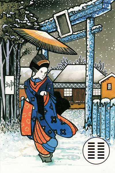 Nella sequenza del Calendario, dopo il 23, L’Usura, Lo Sgretolamento, è il tempo dell’esagramma n° 2 Kun, Slancio Ricettivo: le linee yang dei mesi precedenti sono state completamente scacciate verso l’alto da quelle yin cresciute dal basso.