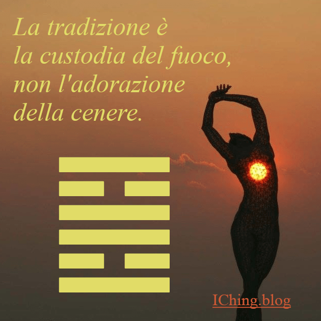 La quinta linea dell’Esagramma, quella della maturità e della consapevolezza, insegna che solo la compassione per sé e per gli altri che nasce dalla comprensione del comune destino di sofferenza può consentire di attingere al fuoco dello spirito, l’unico che non si estingue mai.