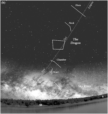 I draghi volano nel cielo fra le stelle e gli astronomi/astrologi della remota antichità ne conoscevano le abitudini e ne seguivano i movimenti. Si tratta del “Drago (Ceruleo)” [2], una super-costellazione, da non confondere con la nostra omonima, che copre un angolo di ben 75° e comprende stelle della Vergine e dello Scorpione. Come si vede dall’immagine, si possono individuare le corna, il collo, il corpo, le viscere, il cuore e la coda del drago.