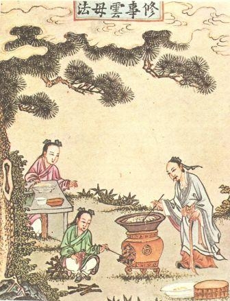 Nella miniatura, in cui viene descritta la lavorazione della mica, si assiste ad una perfetta compenetrazione dell’elemento naturale con quello umano. Le tre persone dipinte svolgono mansioni differenti: la prima, in alto a sinistra, si occupa dello sfaldamento della mica, conservando in un recipiente solo la parte superiore del minerale, simile al cristallo per la sua luminosità; la seconda, in basso a destra, è impegnata nel mescolare la mica con l’acqua del pozzo messe a bollire per sette giorni e sette notti[13] ed infine la terza, in basso a sinistra, controlla il buon andamento costante del fuoco. Pur non presentando plasticità d’espressione – tutte e tre le figure presentano lo stesso lieve sorriso – la dinamicità delle loro azioni è segnalata dalle diverse posizioni delle braccia, che disegnano direzioni confluenti tutte verso il bollitore centrale. E’ chiaro come la figura dell’uomo, intento nel mescolare la mica, sia quella principale, in quanto presenta un abito più elegante, una capigliatura più raccolta – con un fiocco centrale – e si diversifica anche per la presenza di baffi e barbetta, segno di anzianità. Gli altri due uomini hanno una sagoma più ridotta, indossano gli stessi abiti – che si differenziano solo per il colore – e presentano la stessa modalità di pettinatura. Le loro azioni sono inglobate in un paesaggio naturalistico. Il pino, il cui tronco è visibile solo per metà sulla sinistra, estende i suoi rami lungo tutta la parte superiore del dipinto, fungendo da cornice. [14] E’ un pino forte, folto ed il fatto che ci siano dei rami che protendano verso terra – secondo la credenza popolare cinese – sta a simboleggiare l’atteggiamento di vegliardi che si curvano verso la giovinezza [15]. Le nuvole sono dipinte con il contorno in stile ta kou (grosso uncino) [16], ed evocano una sensazione di volume, realizzata da un’elegante pennellata. Il contorno è stato delineato con un marrone chiaro, mentre per la consistenza della nube il pittore ha prediletto un azzurro chiaro.