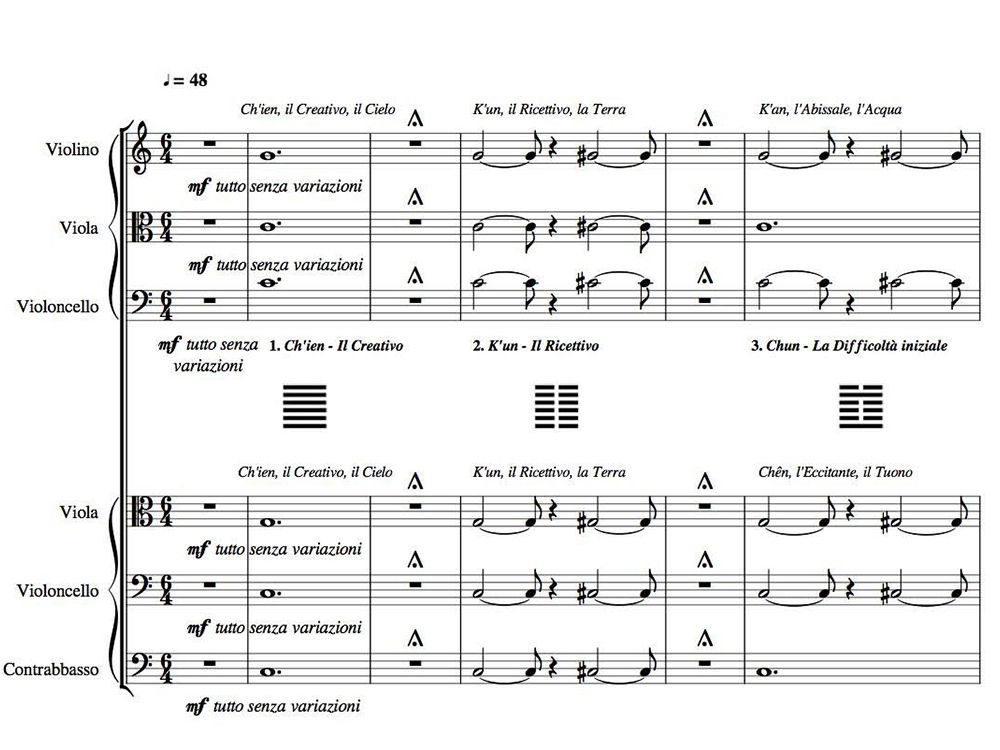I sei suoni non sono stati scelti a caso ma corrispondono ai primi tre armonici sovrapposti (suono fondamentale, suono a distanza di ottava e suono a distanza di quinta) sia per il trigramma inferiore sia per quello superiore. È la combinazione più pura e geometricamente perfetta che si possa immaginare: non ci sono tensioni né ambiguità modali e la scelta degli archi per l’esecuzione mi è parsa come una obbligata conseguenza logica perché la corda, sia essa pizzicata, strofinata o percossa, è ciò che più si avvicina all’idea di vibrazione e quindi di moto. Anche senza conoscere la musica si può intuire il semplice meccanismo di generazione degli esagrammi/accordi guardando questa immagine: