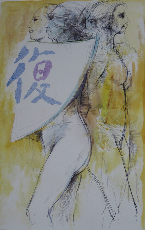 Come Kraczyna, Ricci ha sezionato i componenti di ciascun ideogramma e li ha reimmaginati come figure in incontri visivamente drammatici. Potrebbero quindi essere “conservati” per un futuro recupero in un angolo specifico di un altrettanto immaginato “palazzo della memoria”. L’ideogramma 武 (wǔ) per “guerra” fu la prima parola che assegnò a quel palazzo, con le sue due componenti – il verbo “prevenire” e il sostantivo “lancia” – raffigurati come due guerrieri in lotta. Nella descrizione di Spence, un guerriero “tiene la lancia, pronto a colpire”, mentre l’altro “lo afferra per il polso, sforzandosi di fermare il colpo”. Circa quattro secoli dopo la morte di Ricci, Swietlan Kraczyna è stato guidato da un ideogramma molto simile re-immaginato 坤(kūn) fino al ricordo della “Donna che fa il bagno in un ruscello” di Rembrandt e fino all’acquaforte che l’ideogramma ha ispirato sul suo blocco da disegno.