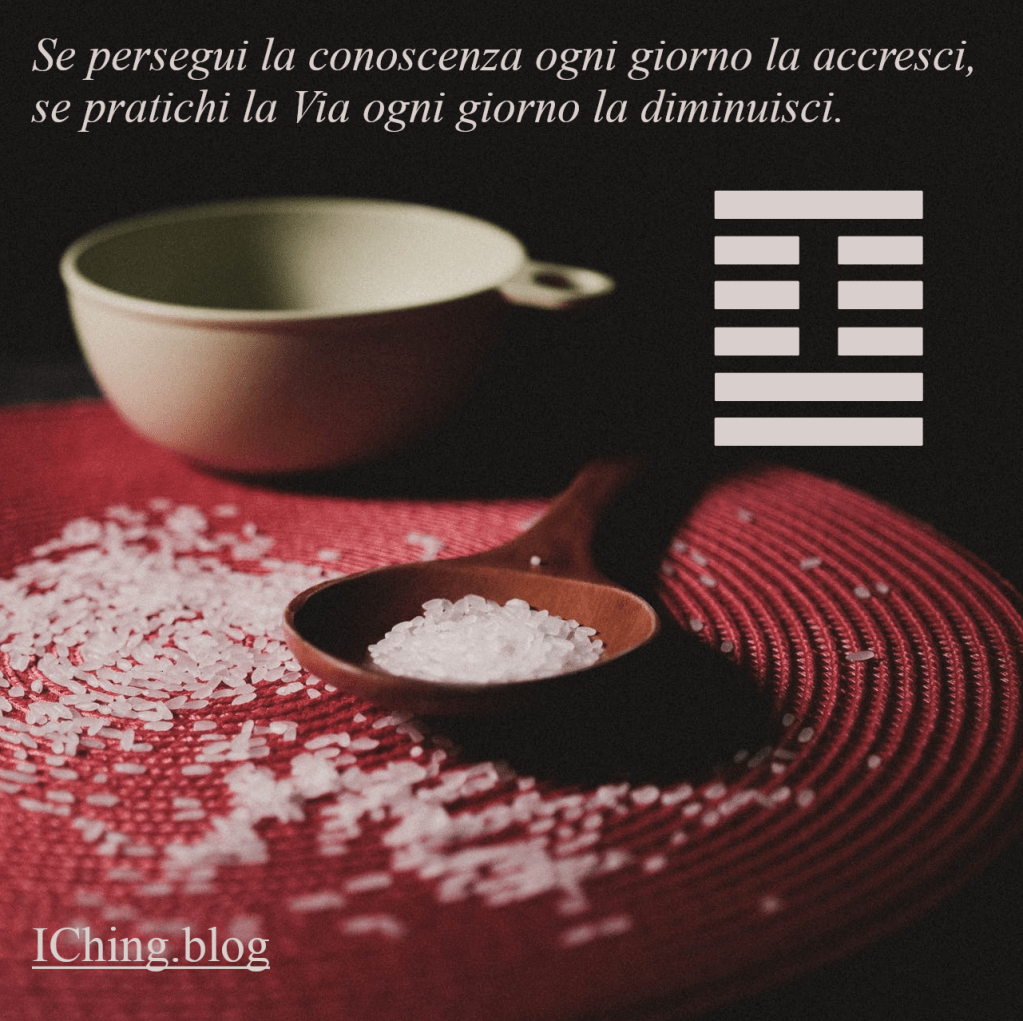 Ester ha interrogato l’I Ching la prima volta, dopo che lui le aveva comunicato la sua decisione, ottenendo l’esagramma 36 “L’Ottenebramento della Luce” che muta nell’esagramma 24 “Il Ritorno” e poi ancora, dopo che lui se n’era andato di casa, ottenendo l’esagramma 26 “La Forza Domatrice del Grande” che muta nell’esagramma 41 “La Diminuzione”.